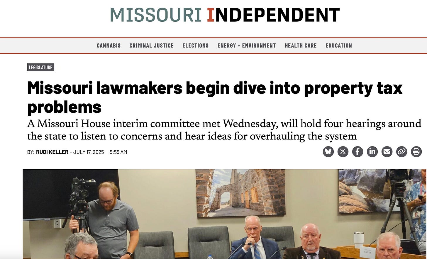 REAL ESTATE TAXES IN MISSOURI ARE OUT OF CONTROL. WHY HAS IT TAKEN THIS LONG TO ADDRESS THIS? JACKSON COUNTY HAS BEEN SUFFERING FOR YEAR. THIS IS ALL A BIG CIRCUS. A JOKE, REALLY. IT IS TIME MISSOURIANS STOOD UP FOR ACTION. ENOUGH OF THE BIG TALK.