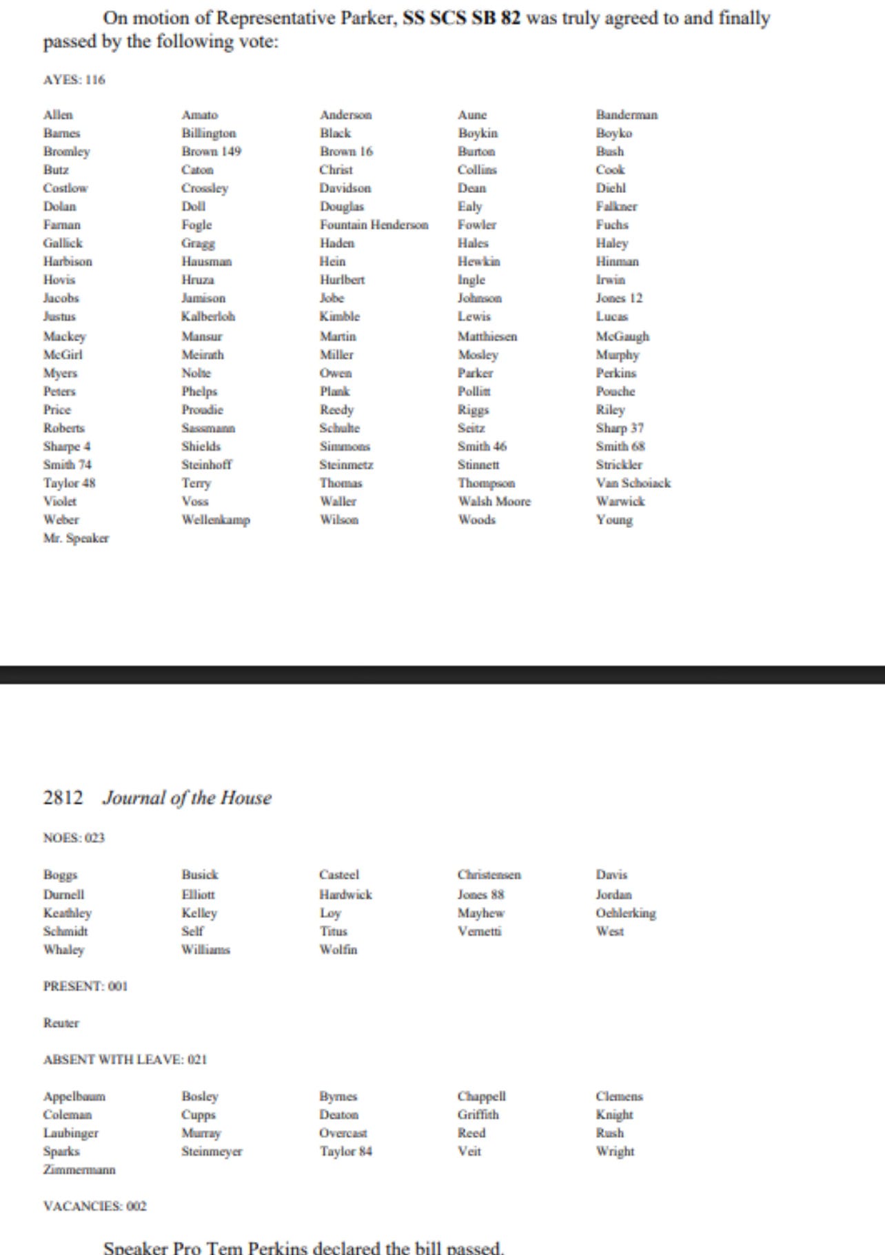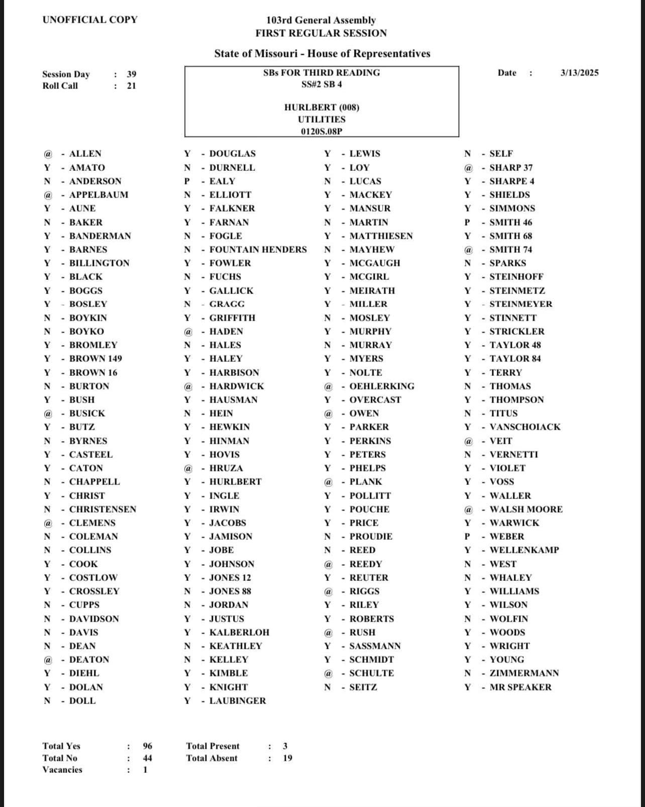 MISSOURI STATE REPS “YES” VOTES FOR SB4 (Utility bill that burdens rate payers in the construction of public utility infrastructure: