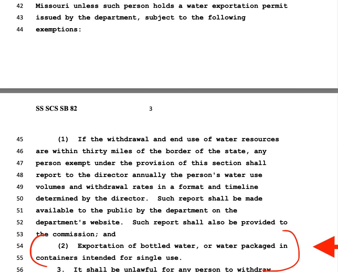 UNDERSTAND THIS: THE MISSOURI LEGISLATURE GAVE MAJOR WATER BOTTLERS AN EXEMPTION FROM BEING REQUIRED TO OBTAIN A PERMIT FOR WITHDRAWING AND EXPORTING MISSOURI’S WATER. WILL MISSOURI BE THE NEXT MICHIGAN? YOUR ELECTED POLITICIANS HAVE ALLOWED THIS.